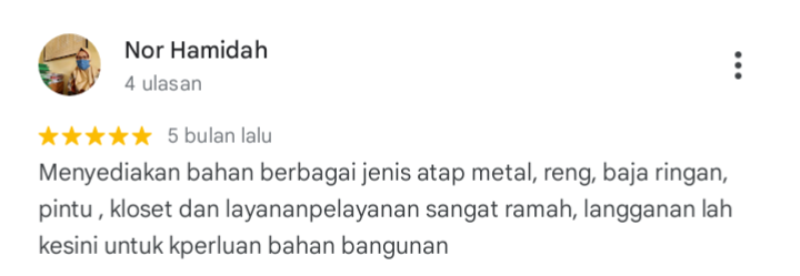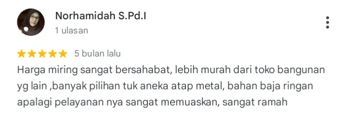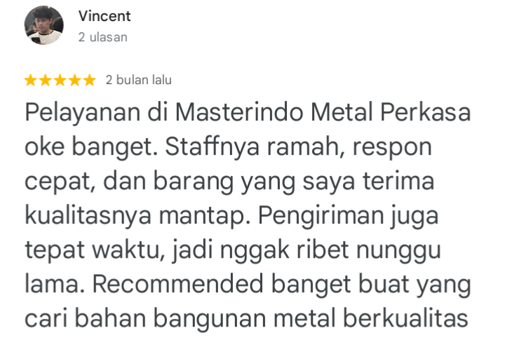 TESTIMONIApa pendapat mereka? Ulasan pelanggan tentang Masterindo Metal Perkasa 5,0★★★★★ 125 ulasan google maps HUBUNGI KAMIUntuk informasi lebih lanjut,hubungi tim marketing kami.whatsapp “Kami siap melayani dengan sepenuh hati”